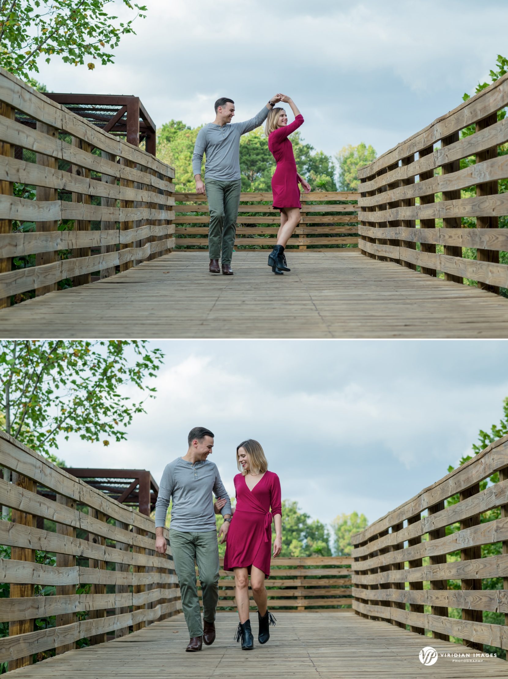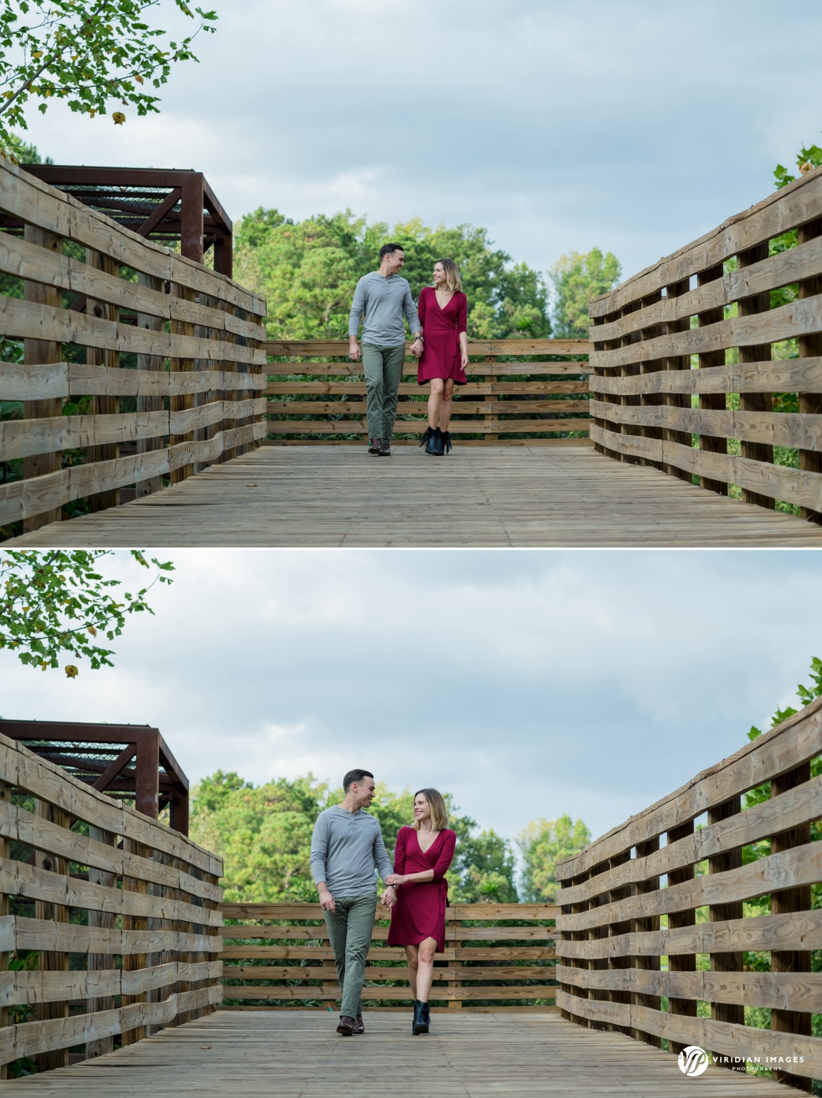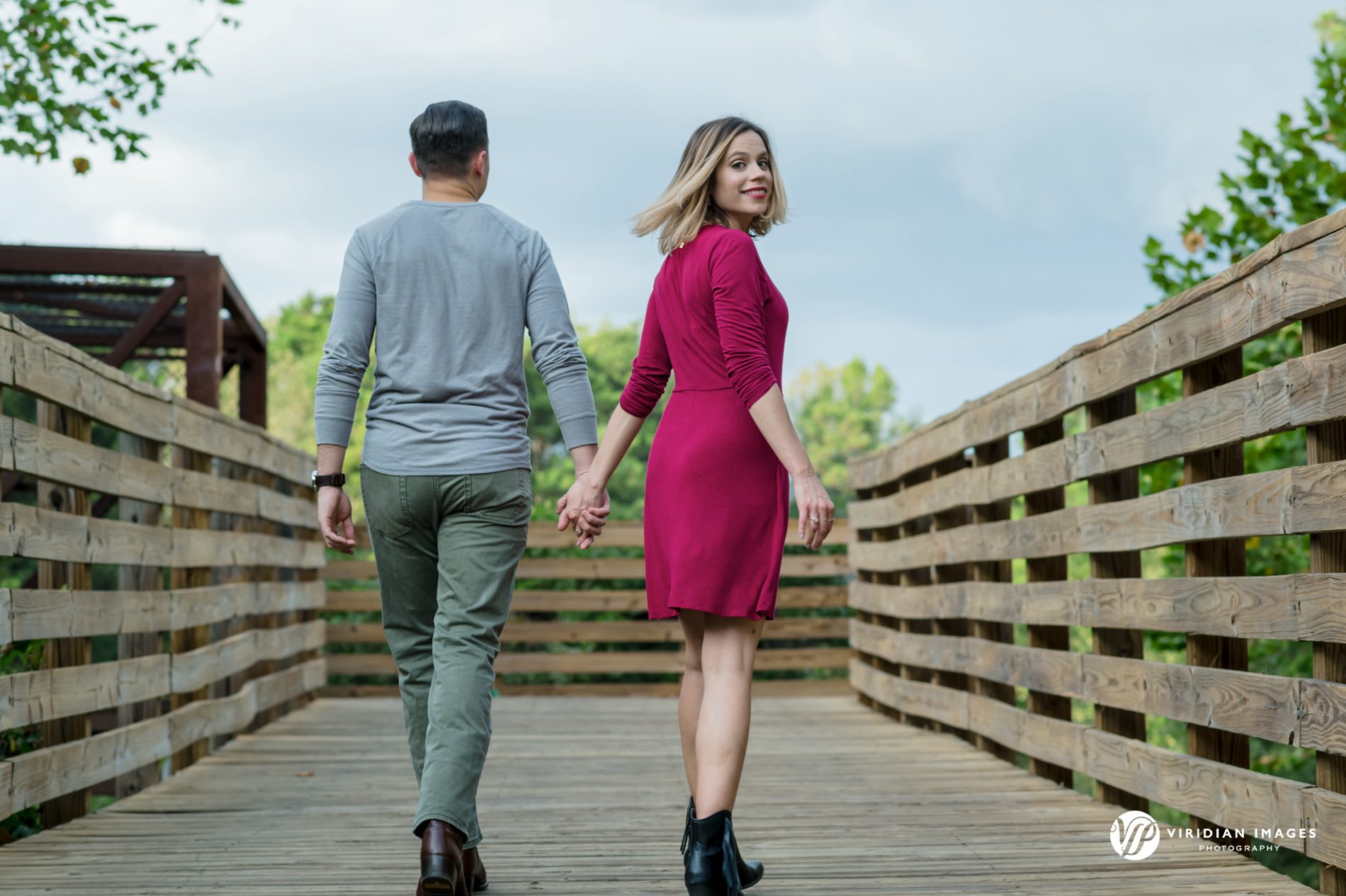 couple walking back and girl looks back on wood boardwalk during engagement session