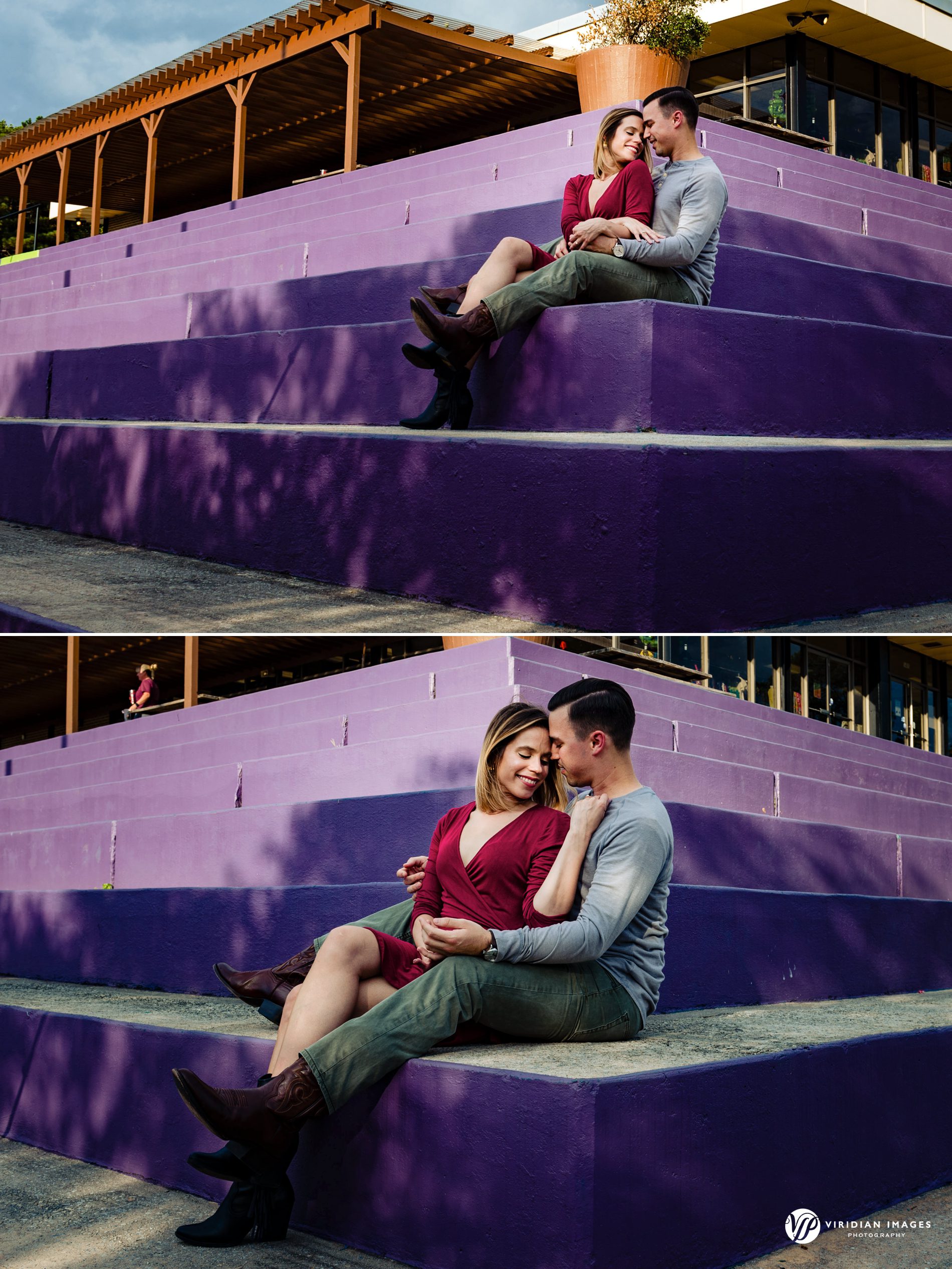 couple sitting on purple concrete corner stairs at Mason Mill Park Decatur, Georgia engagement session photo