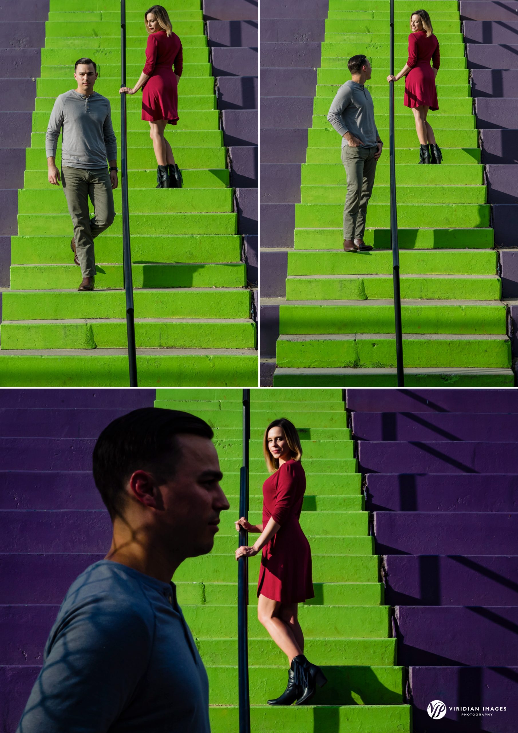 couple flirting on purple and green steps of tennis center at Mason Mill Park Decatur, GA for engagement session photo