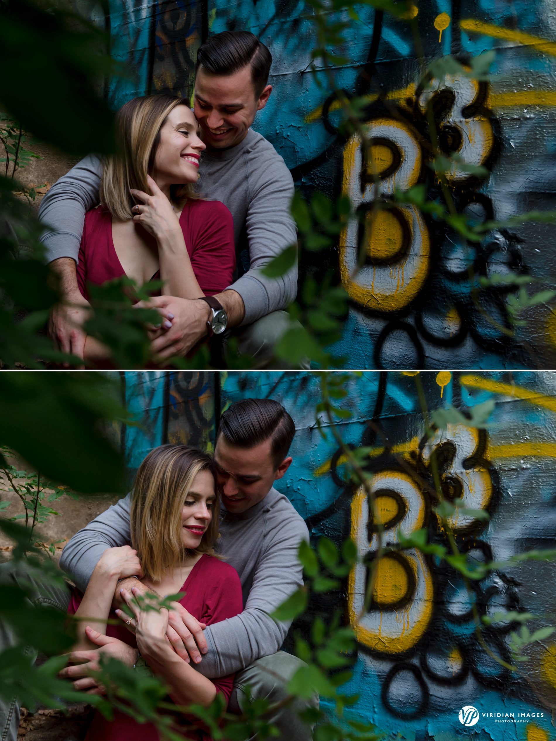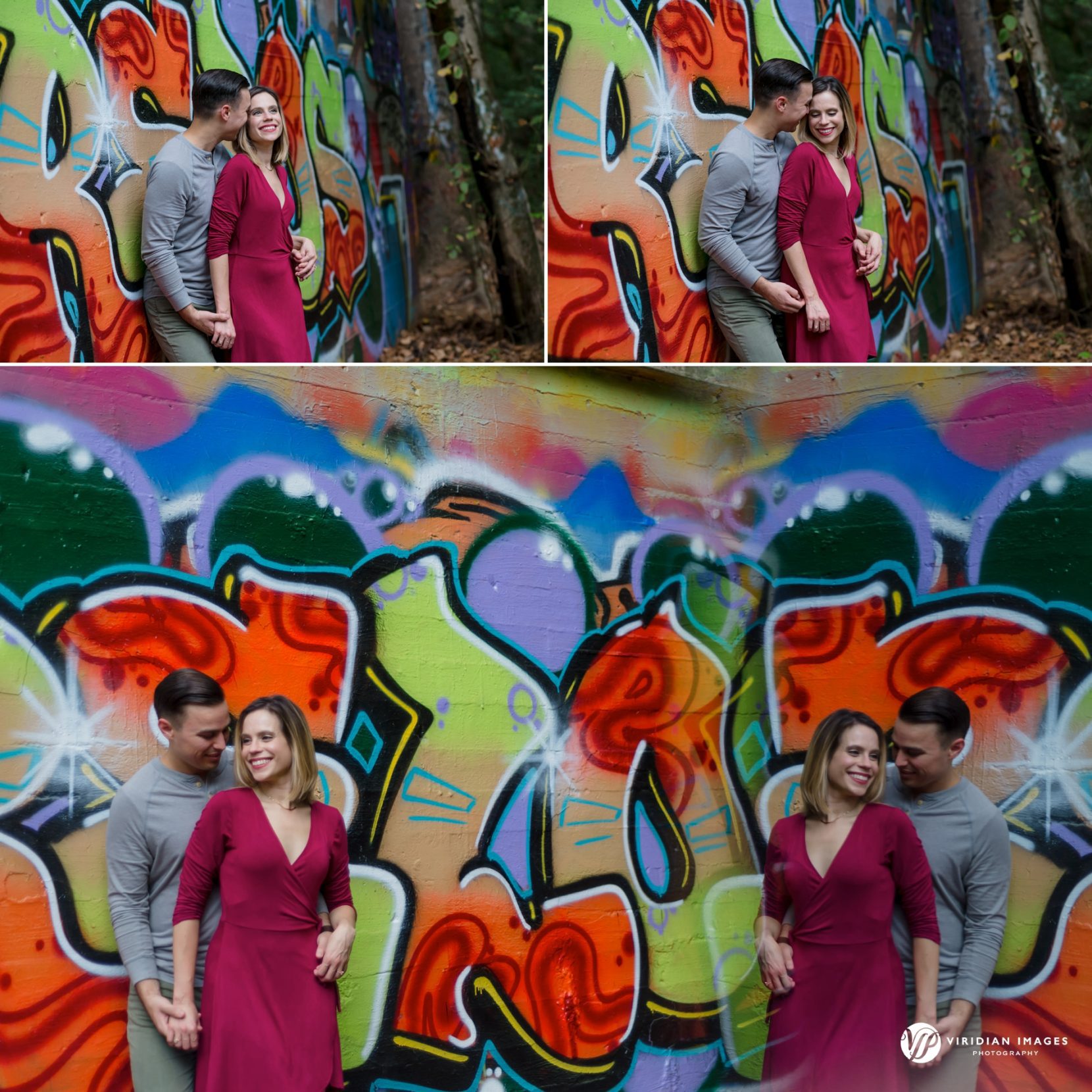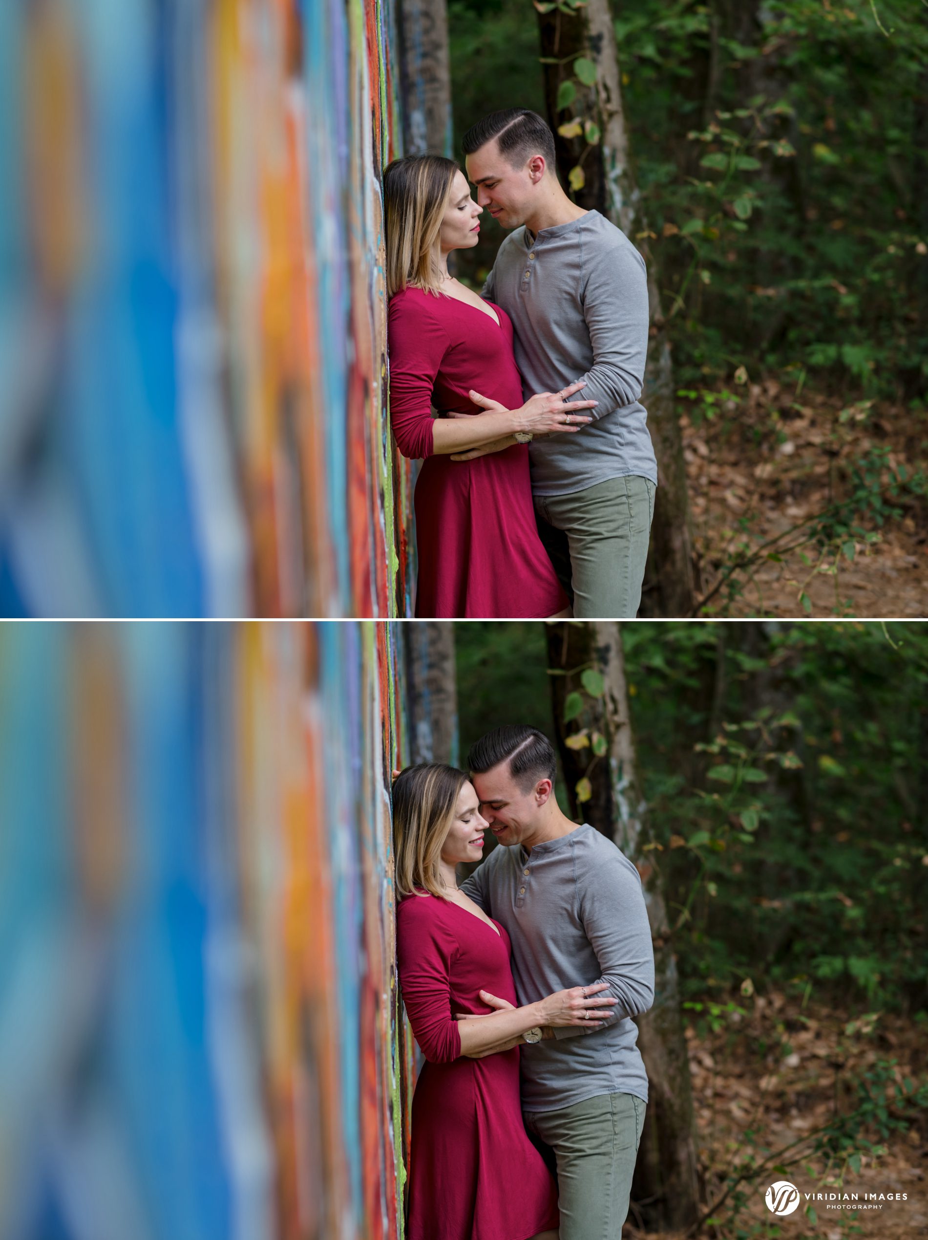 romantic and intimate moment with couple embracing against graffiti wall at Mason Mill Park, Decatur, GA for engagement session
