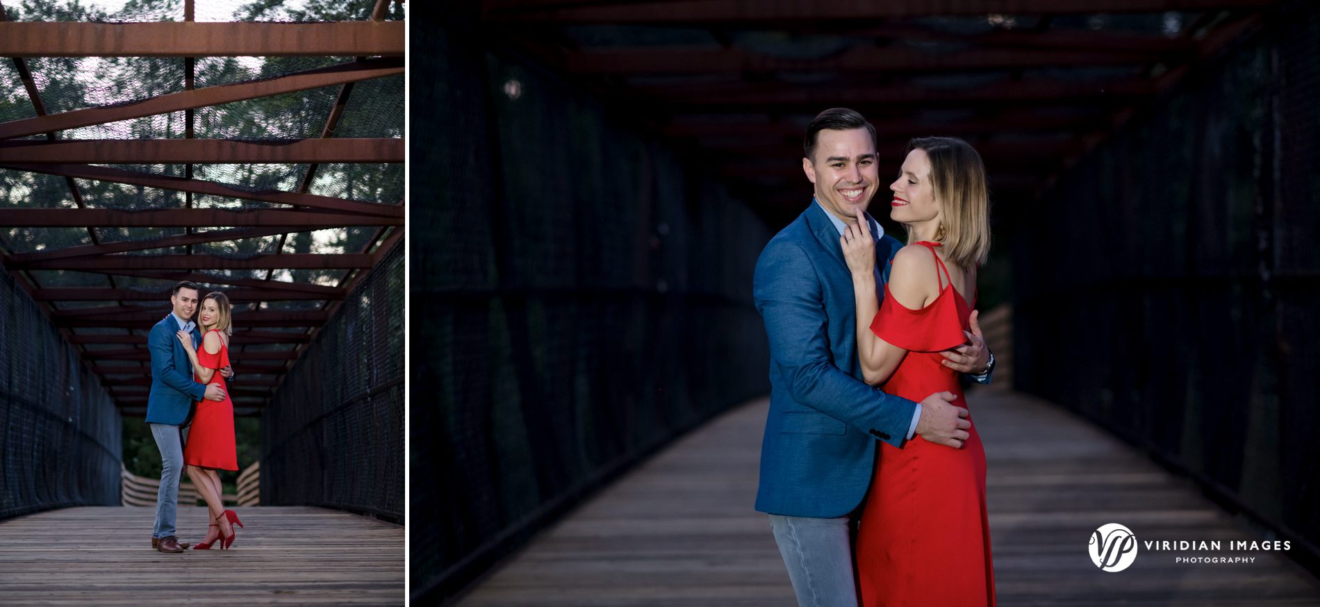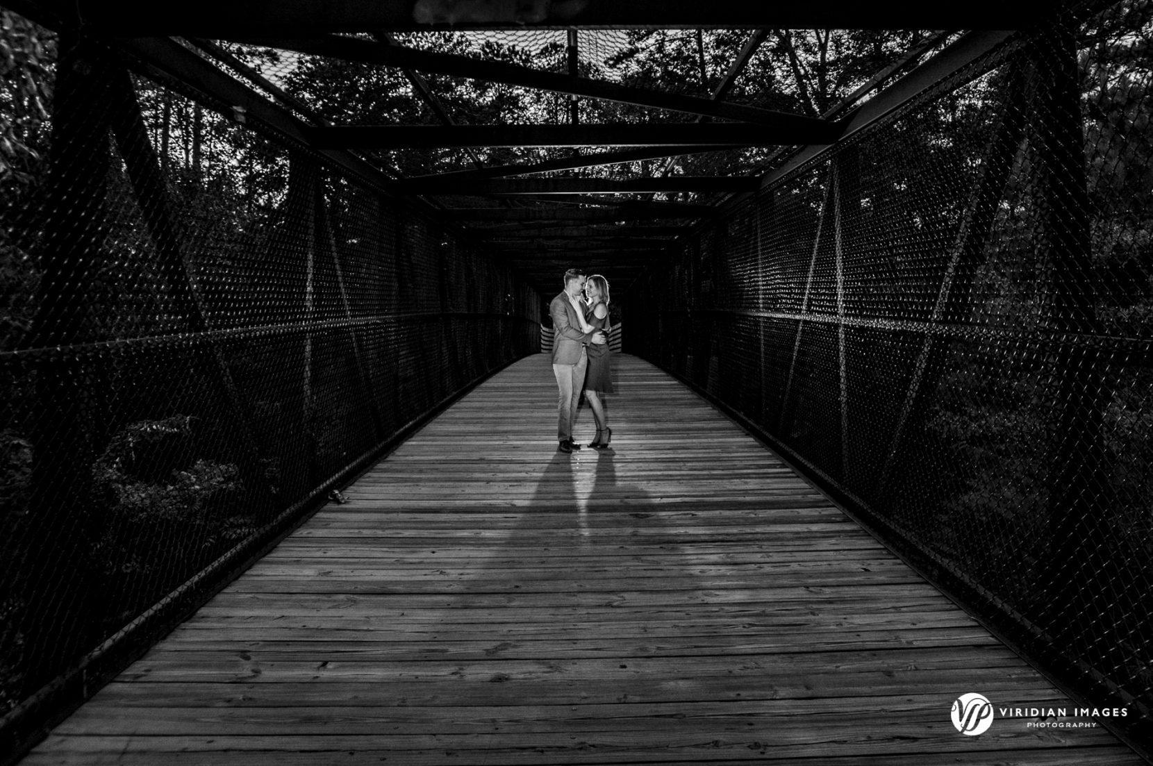 creative, backlit photo of couple center of metal covered bridge for engagement session at mason mill park decatur, georgia photo