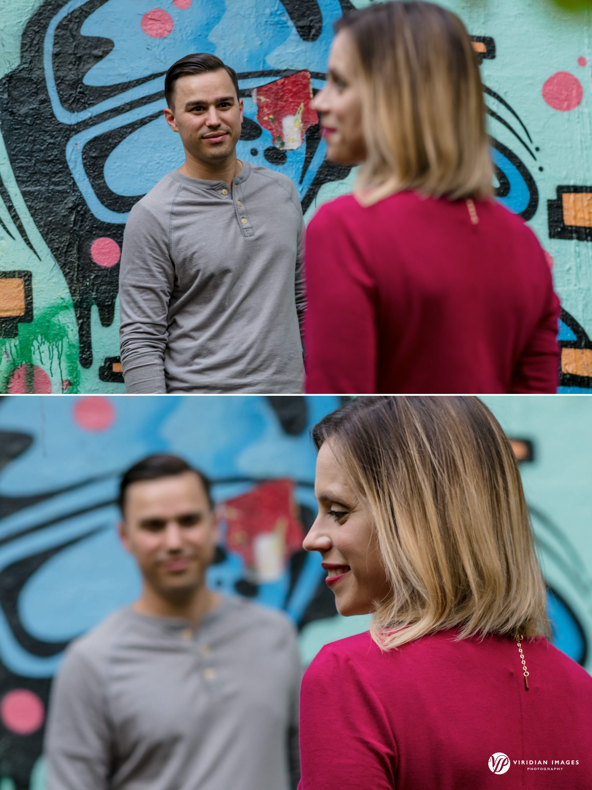 photo of couple apart with one looking at the other in front of graffiti wall at Mason Mill Park