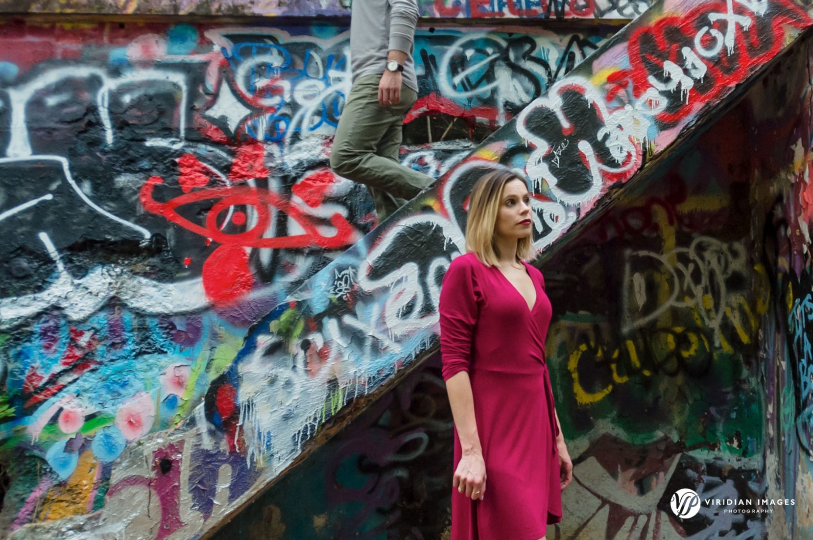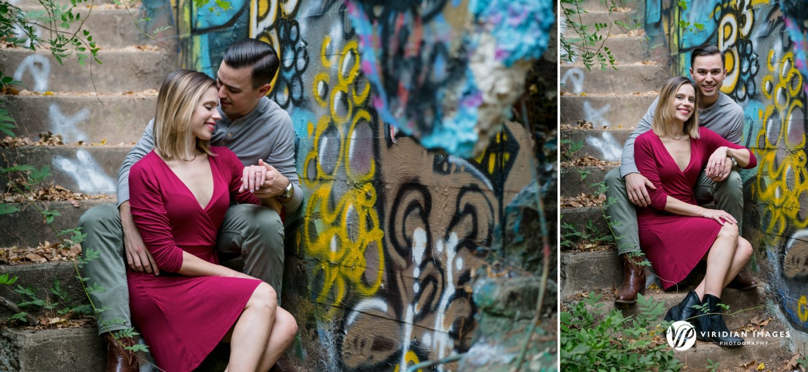 couple sitting on graffiti covered concrete stairs in Decatur, GA engagement session photo