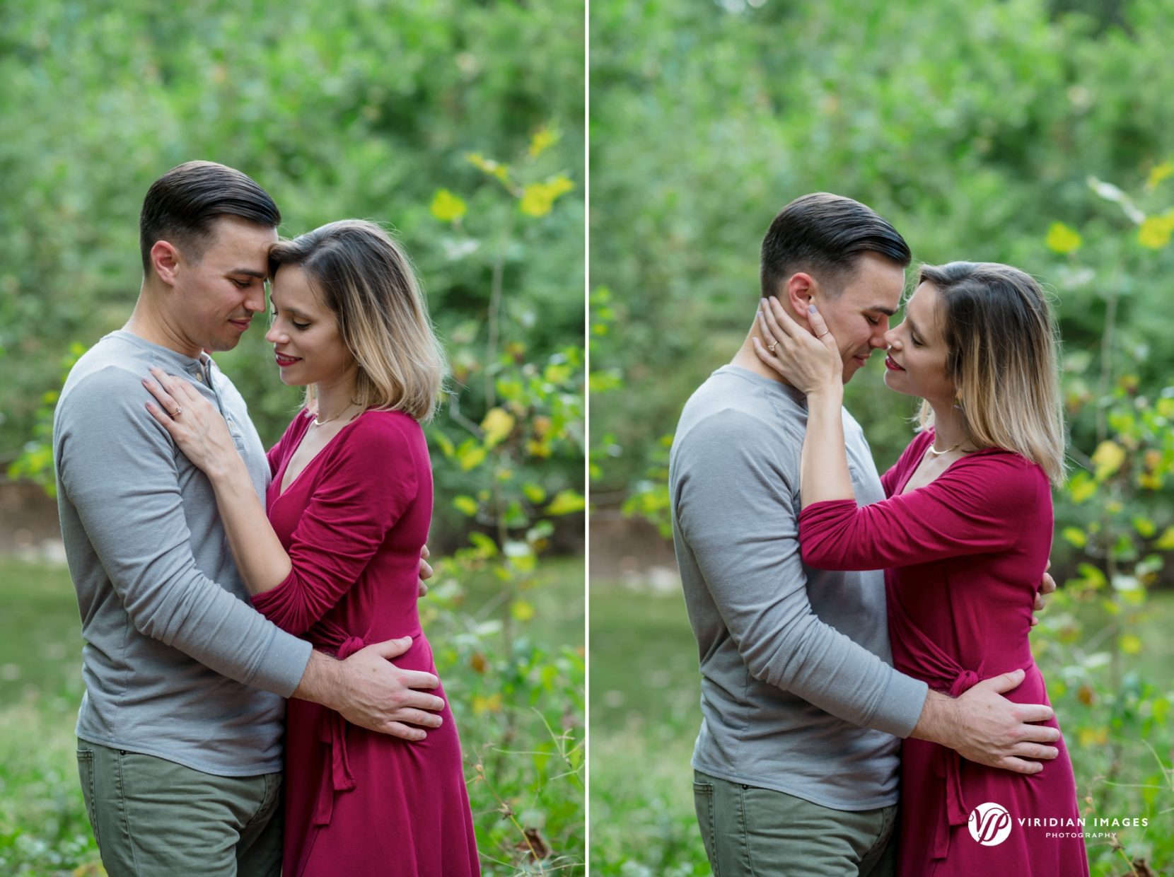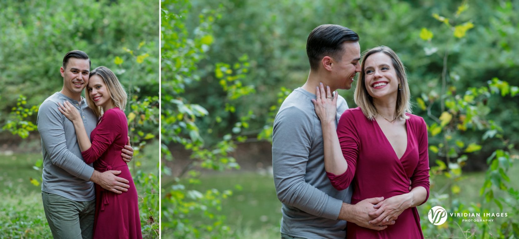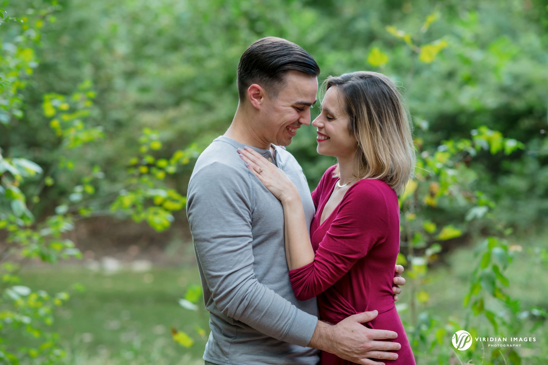couple hugging and smiling showing engagement ring in front of meadow at Mason Mill Park Decatur, GA
