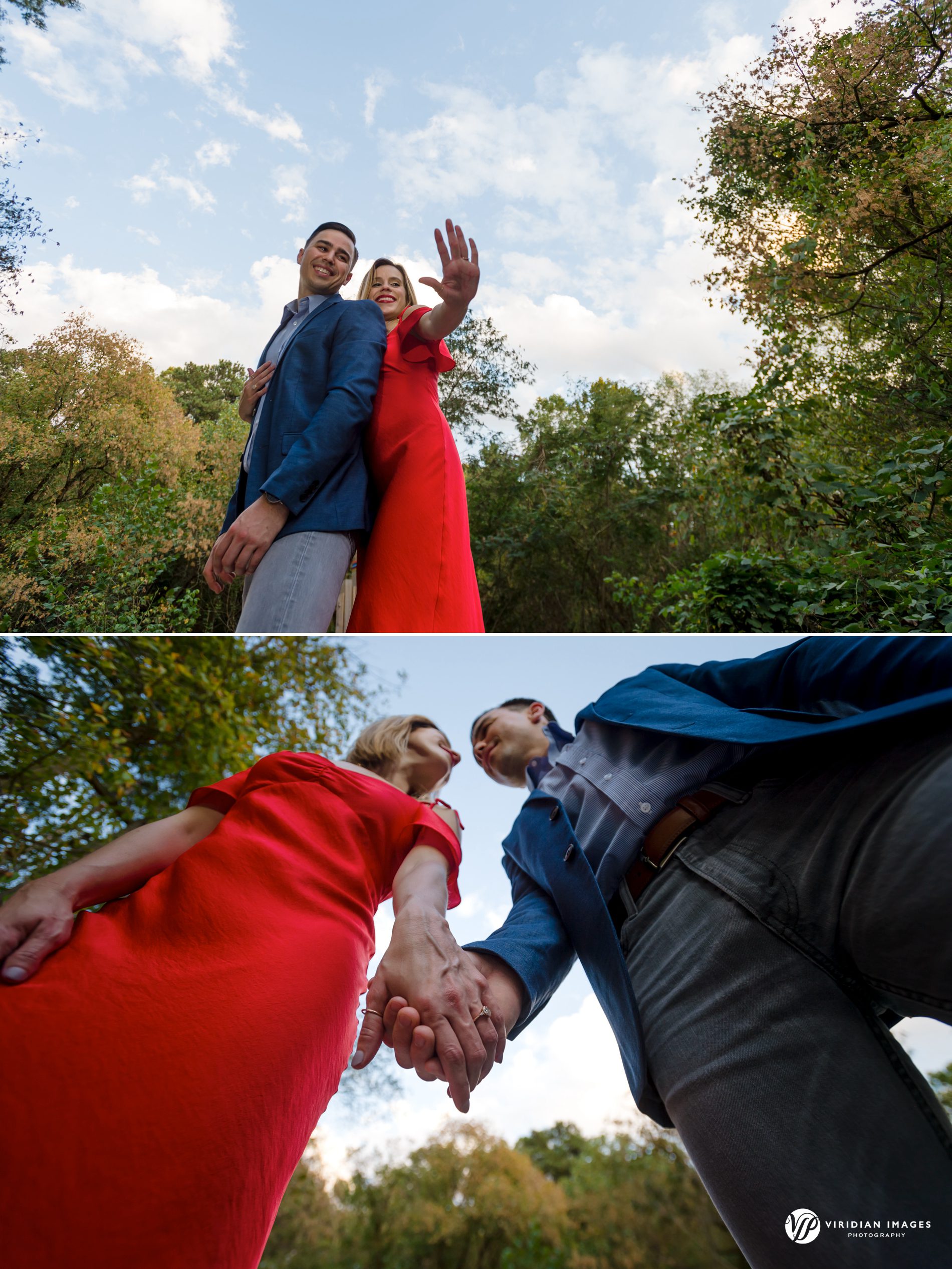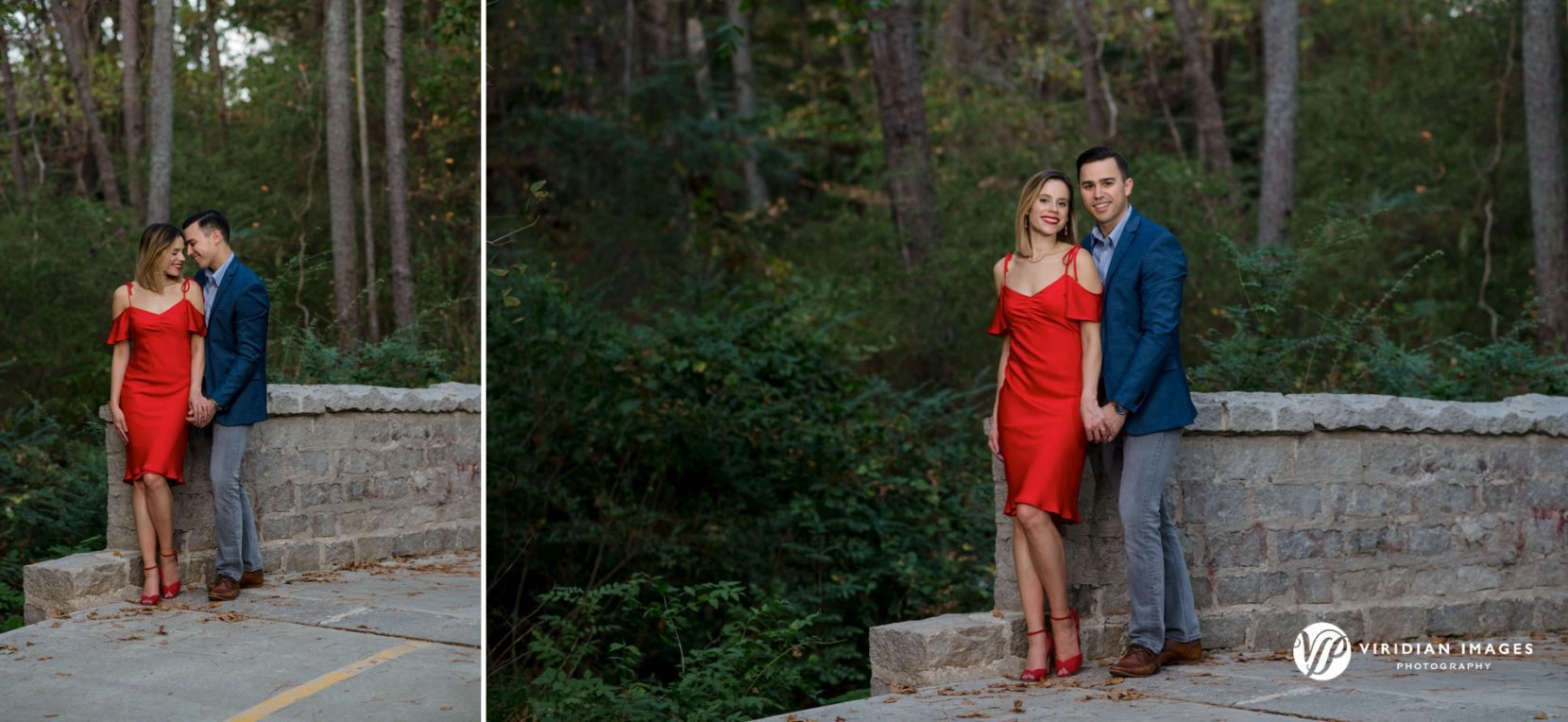 mason mill park engagement portrait session. red dress and blue shirt and jacket.