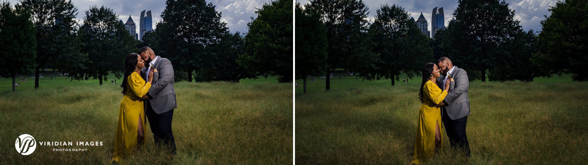 Piedmont Park is one of Atlanta’s most beloved locations for engagement photos, offering lush greenery, iconic city skyline views, and hidden corners for romantic moments. When Danielle and Stephen met us there for their engagement session, the sky quickly reminded us of summer’s unpredictability. Shortly after we began, the rain came pouring down.