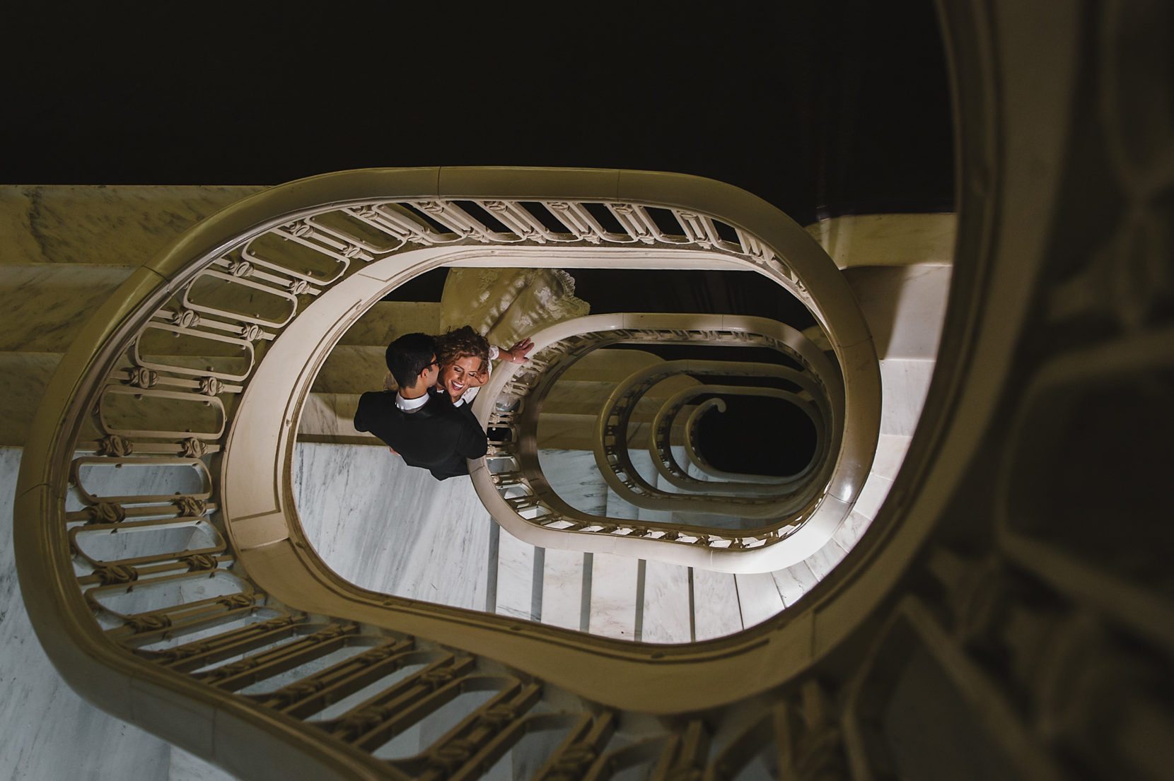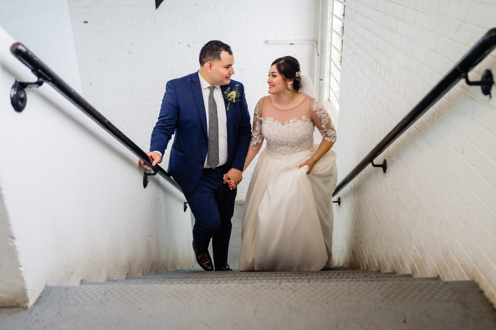 It was time for the first look. We chose a specific portion of the space that had large, elegant and expansive drapes by Unique Event Elements. This allowed the couple some measure of privacy for the first look but it also offered an opportunity to shoot through the sheer drapes for some creative bokeh-like layers for the images. As soon as they had concluded their first look we began working through a series of wedding portraits. You really don’t have to go far for interesting locations; there’s plenty to use inside the venue. The large windows, rustic floors, industrial ceilings and stairs all provide simplicity and charm for these types of photos.