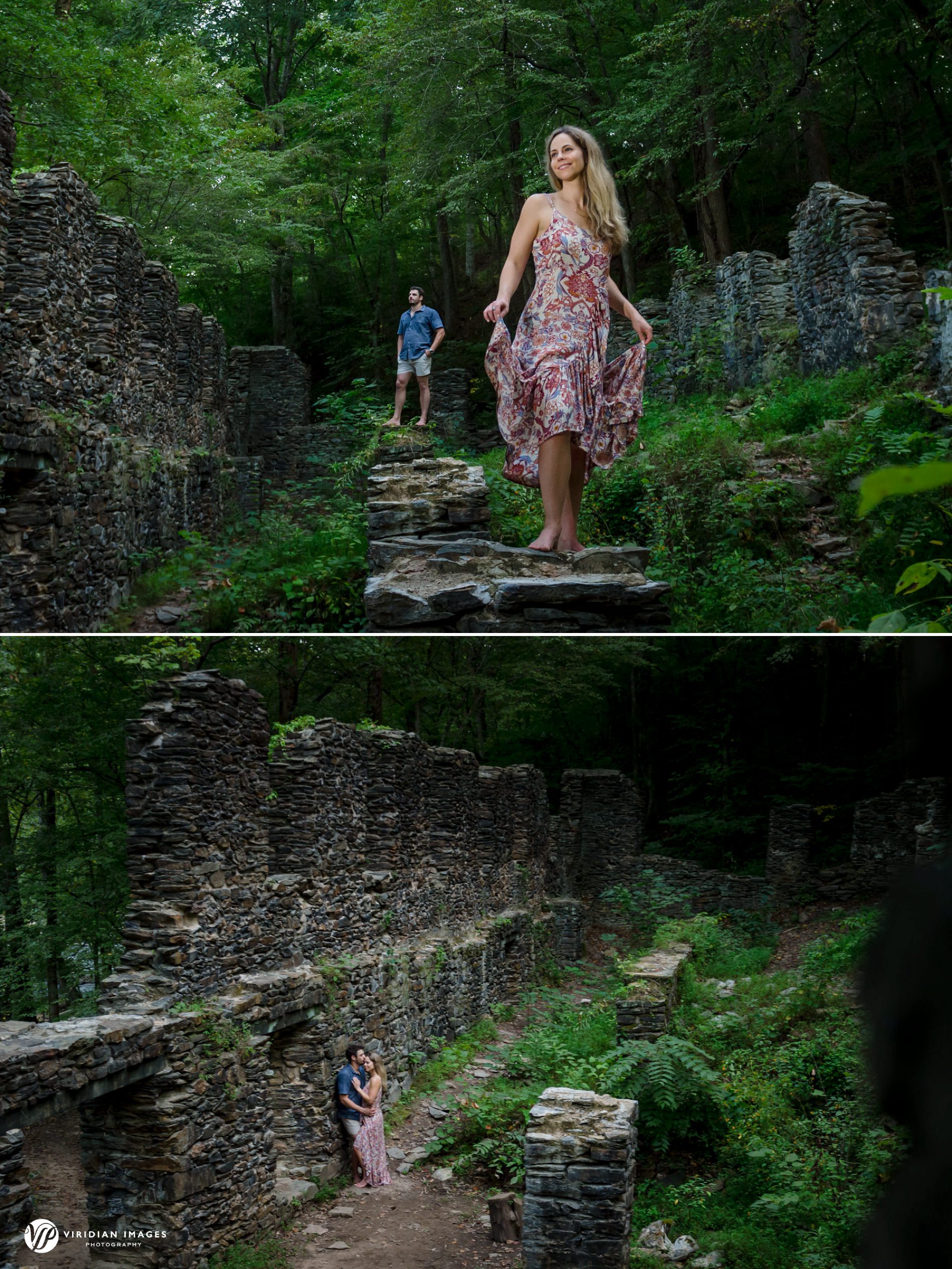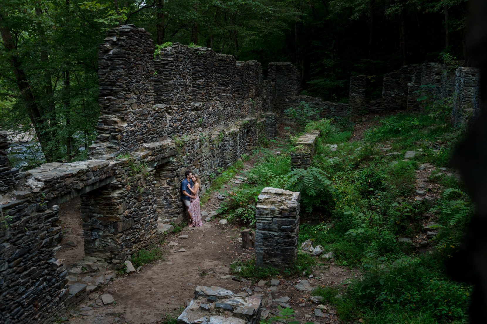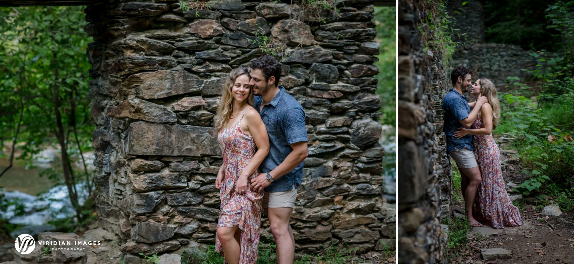 Courtney’s flowy dress moved effortlessly with the ever so slight breeze, and Dylan’s casual, clean style complemented the natural backdrop. Together, they looked completely at ease among the stonework and the rushing river behind it. We captured a series of portraits that balanced editorial drama with deep emotional connection—images that speak not only to their love but also to the legacy they’re building.