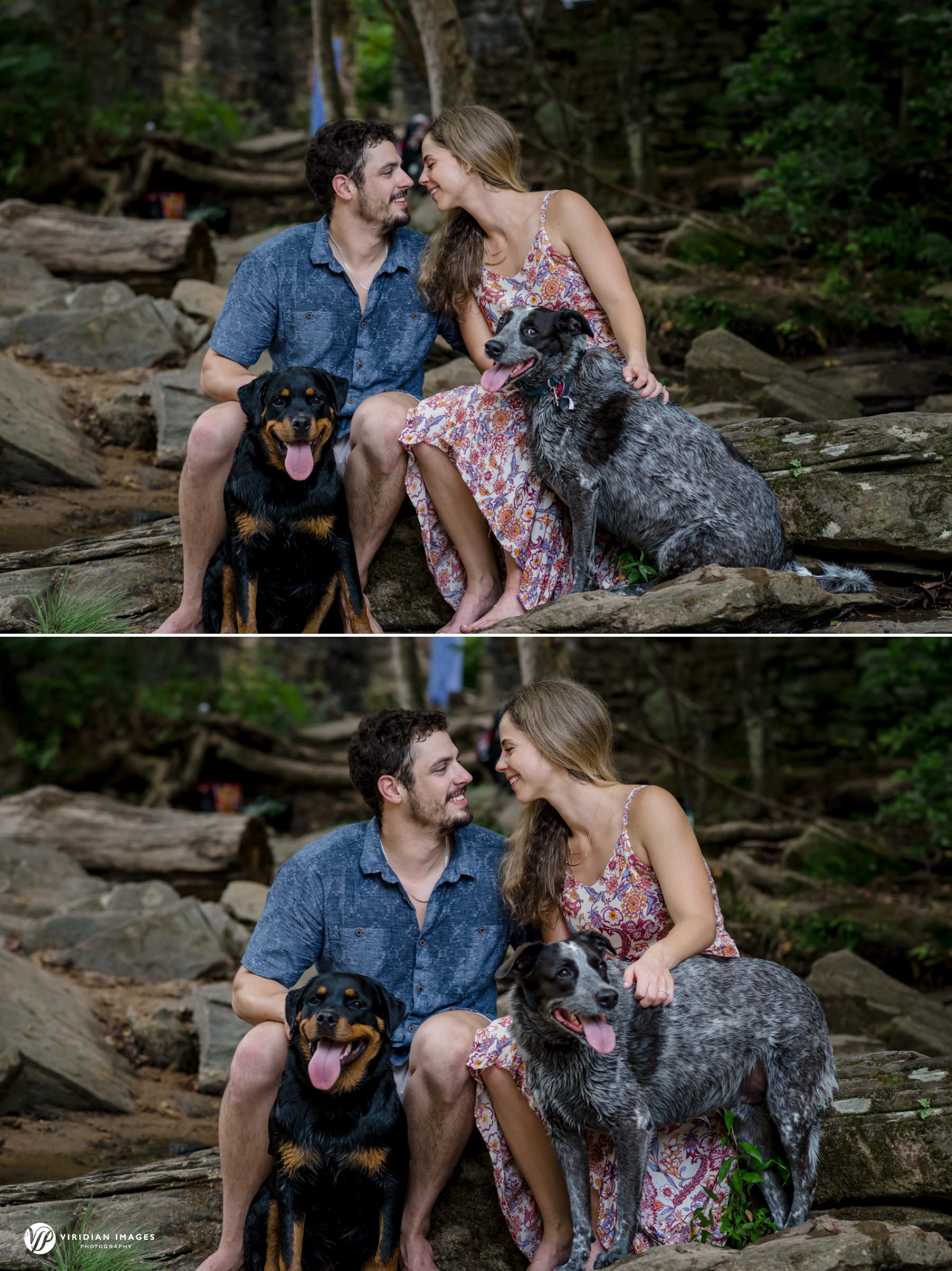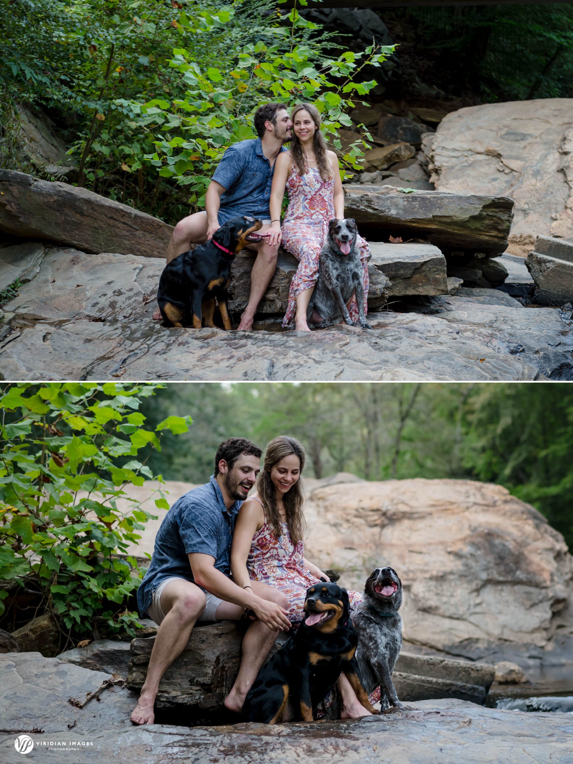 The dogs joined in for a few frames too, perched among the rocks and greenery, part of this love story just as much as their humans.