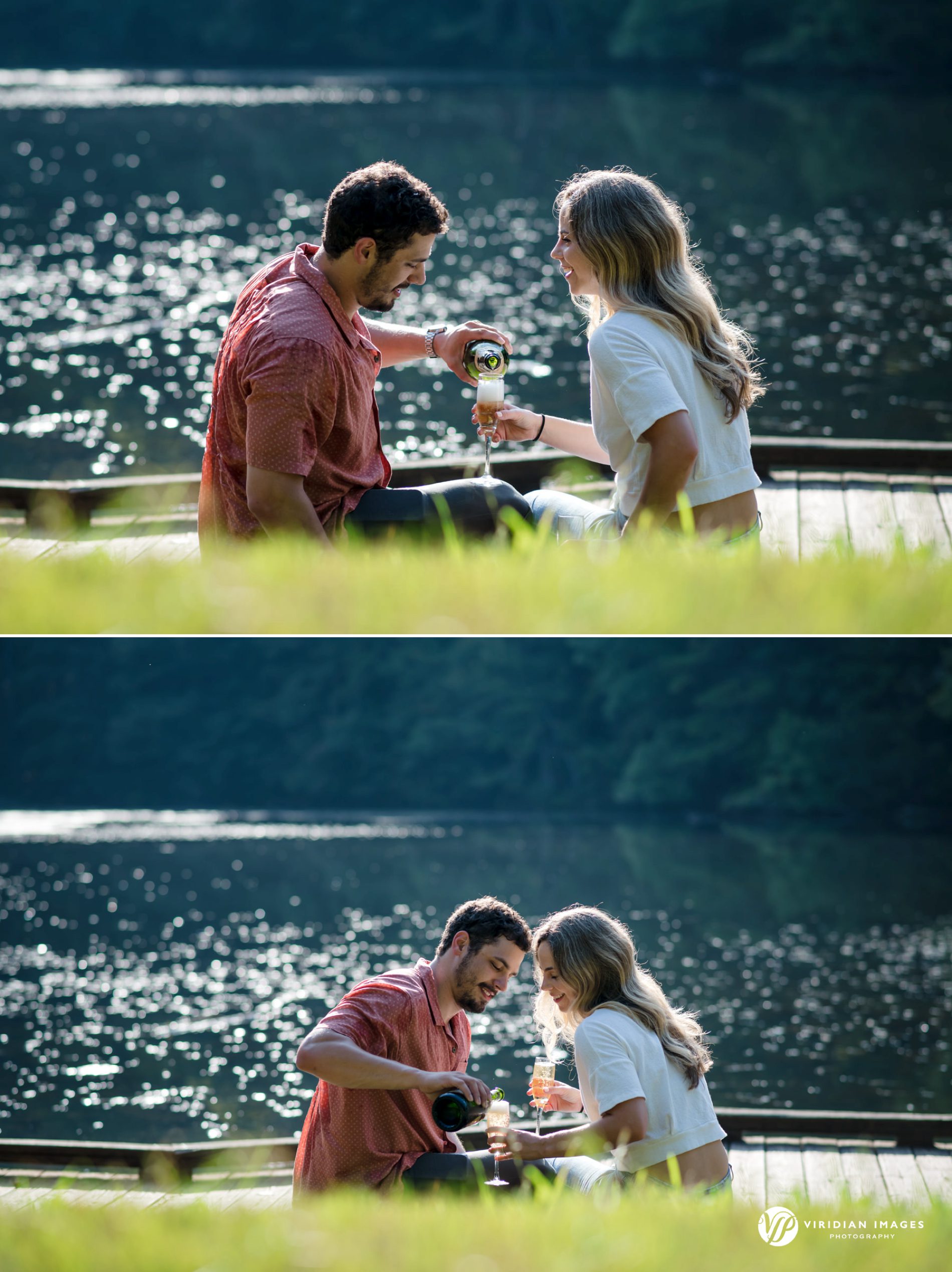 We kicked off their Sope Creek engagement session on the wooden deck overlooking the lake—an idyllic, peaceful spot nestled in the trees. The late afternoon light flickered through the canopy, giving us a soft glow as Courtney and Dylan sipped chilled champagne and took a quiet moment together. Their two dogs wandered nearby giving them some alone time.