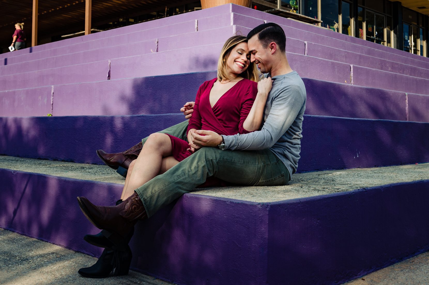 Kim started our session in a raspberry-hued dress paired with booties, while Michael kept it casual-cool in jeans and a long-sleeved tee. As the sun started to dip lower, they elevated the vibe with a stunning red dress and heels for her and jeans with a sharp blue shirt and blazer for him. It was effortless elegance meets playful charm—the perfect snapshot of who they are as a couple.