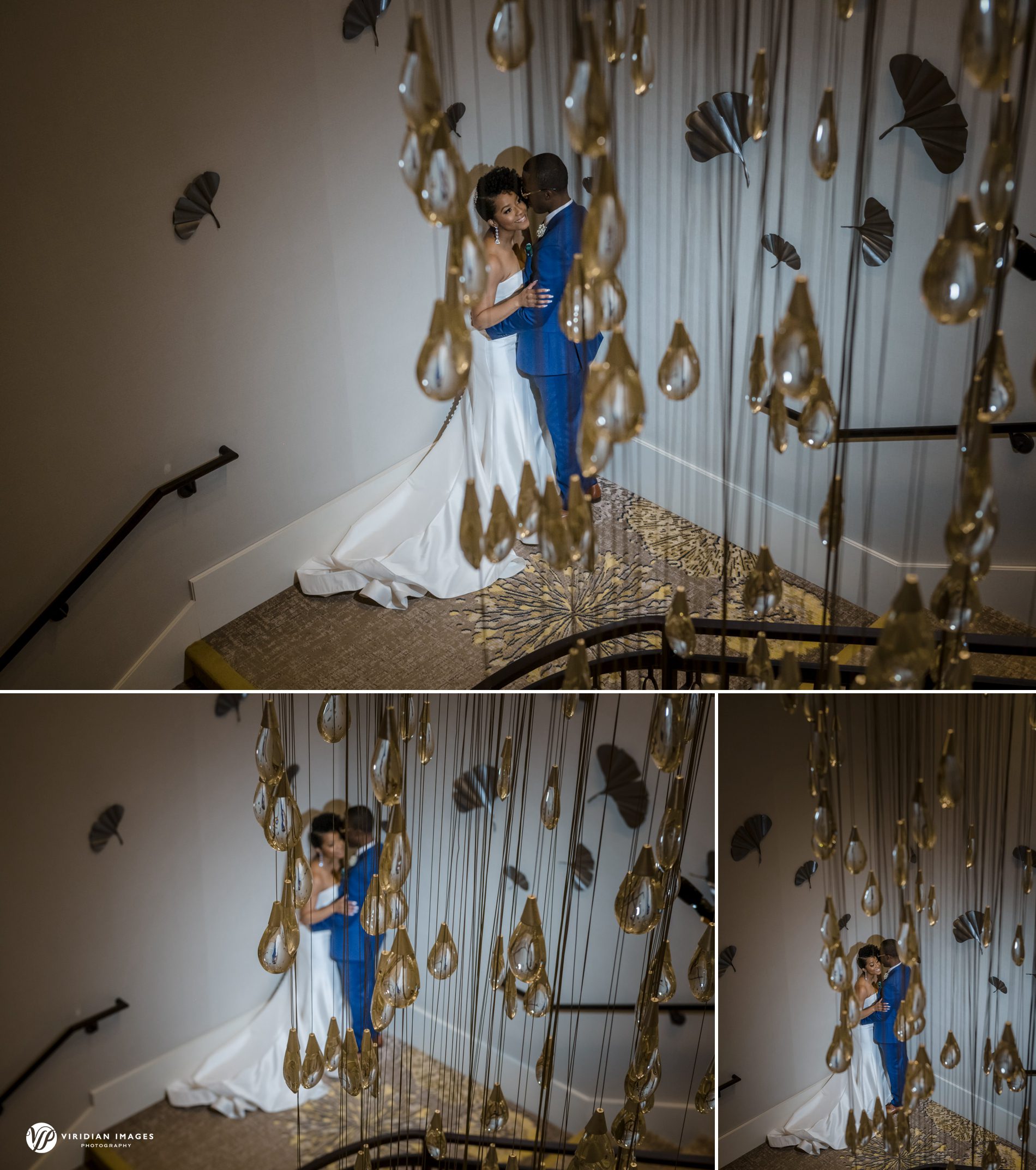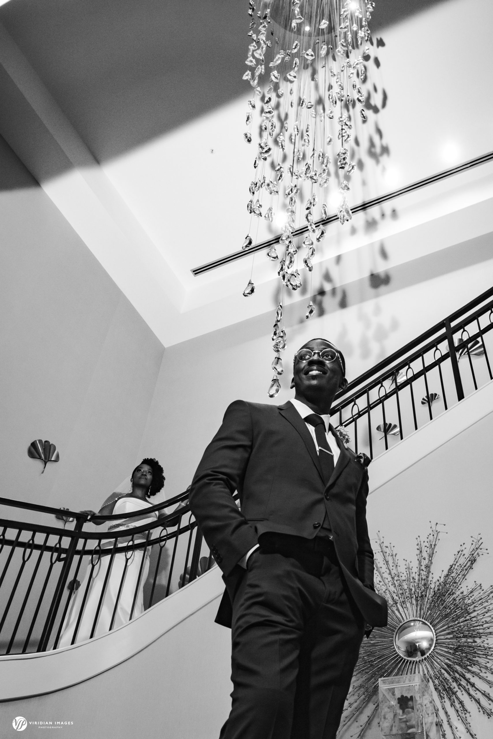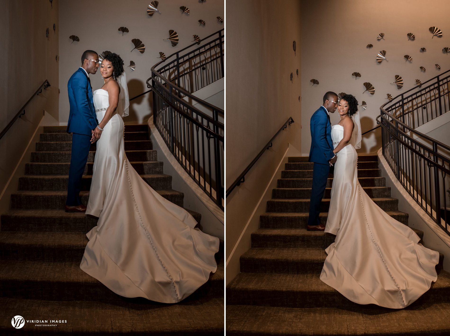 The grand staircase became the setting for timeless bridal portraits, while the glow of the chandelier added dimension and drama. Every pose, every frame, was carefully composed to bring out the couple’s personalities while showcasing the venue’s architectural beauty.
