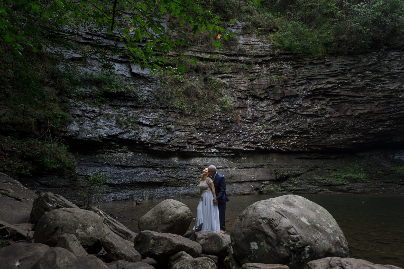 Flor and Marino wanted to have a post wedding adventure session. You don’t have to tell us twice. We were excited to photograph in Cloudland Canyon in Rising Fawn, Georgia. It’s a beautiful national park up in the northwest corner of the state. It’s a bear to get there with so many steps and stairs, but the view was well worth it. These two were up for anything we wanted, to the point of diving in and enjoying each other in the water by the waterfall. Talk about a couple that are game to do anything for the photo. They did not disappoint.