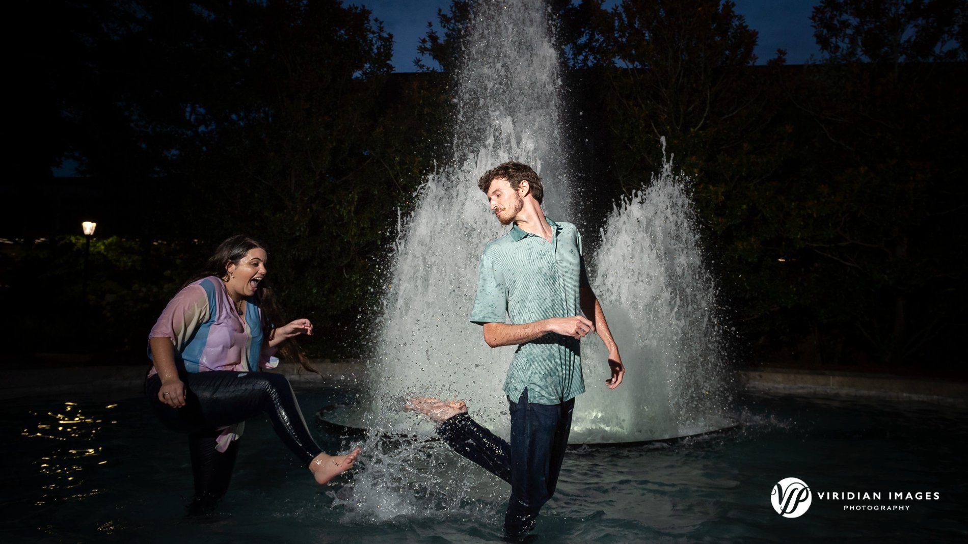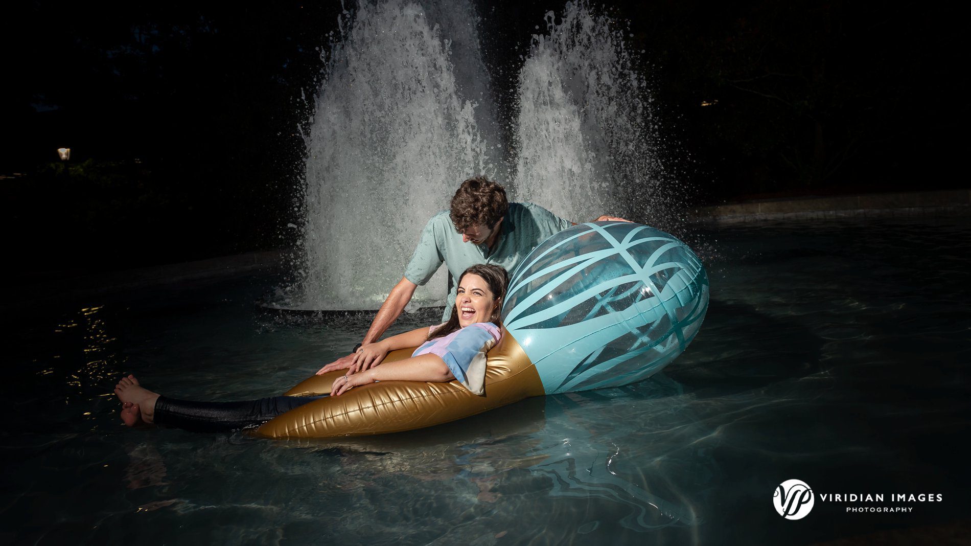 We wrapped the evening in front of the campus fountain, where Cillian and Calen made good on a promise to end things with a bang. Armed with an inflatable ring floaty, they jumped right in, clothes, laughter, and all. The splash, the smiles, and the spontaneity perfectly summed up who they are together: adventurous, uninhibited, and absolutely in love.