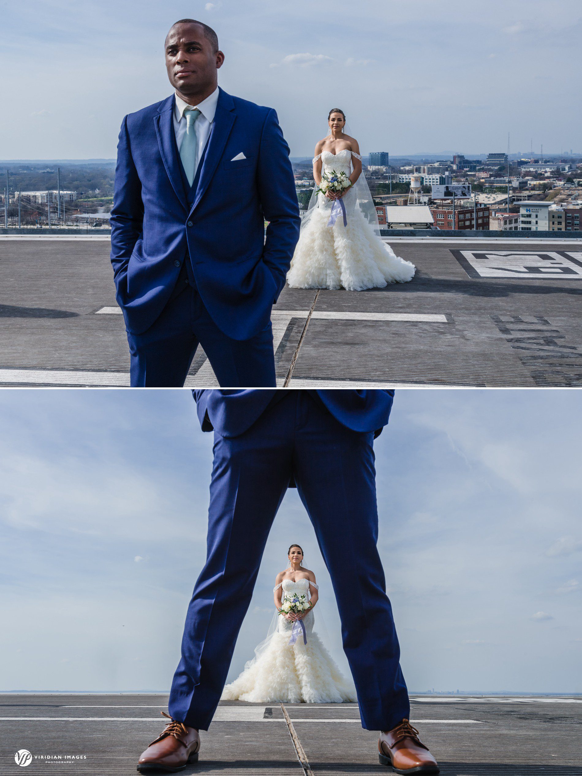 As the day turned into evening, the couple returned to the helipad for sunset portraits. Bathed in warm light with the glittering skyline behind them, these images perfectly captured the bold and cinematic essence of their wedding day.